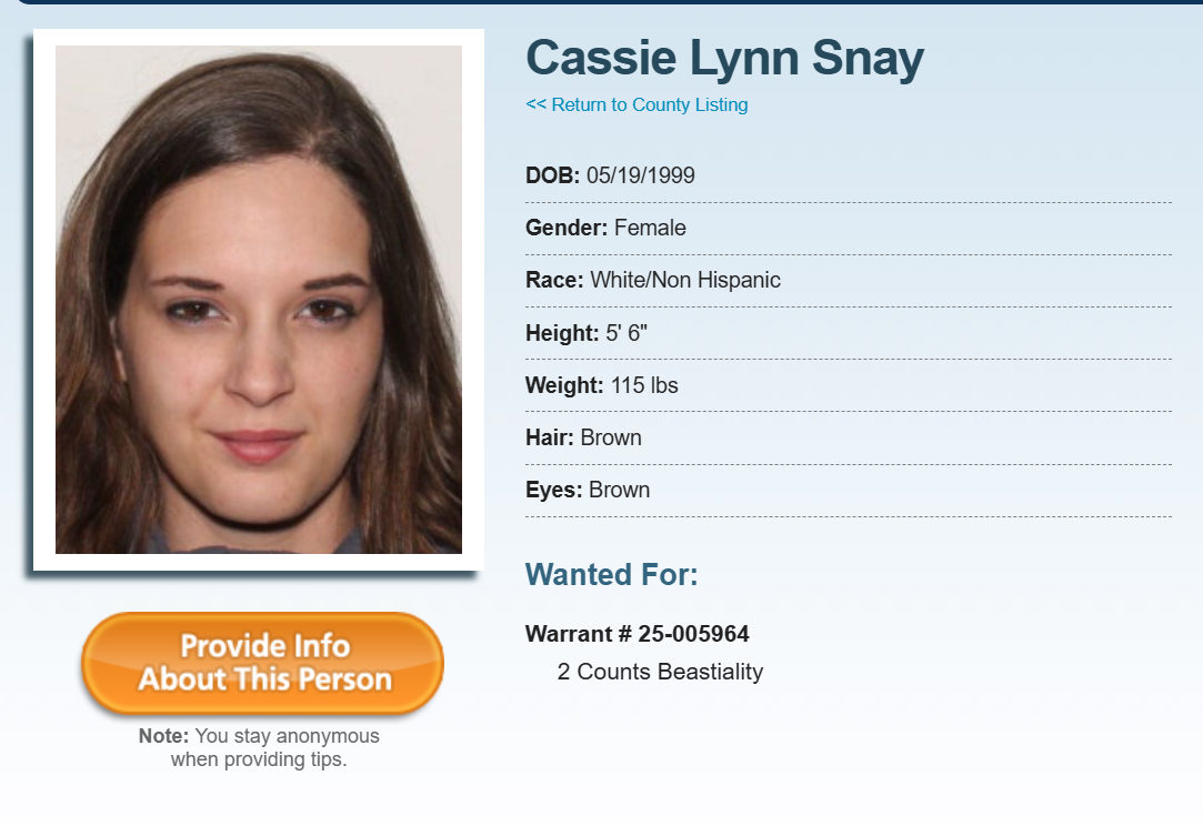 Cassie Lynn Snay 2 Counts Bestiality Fort Wayne Allen County Indiana | Trey Mettler