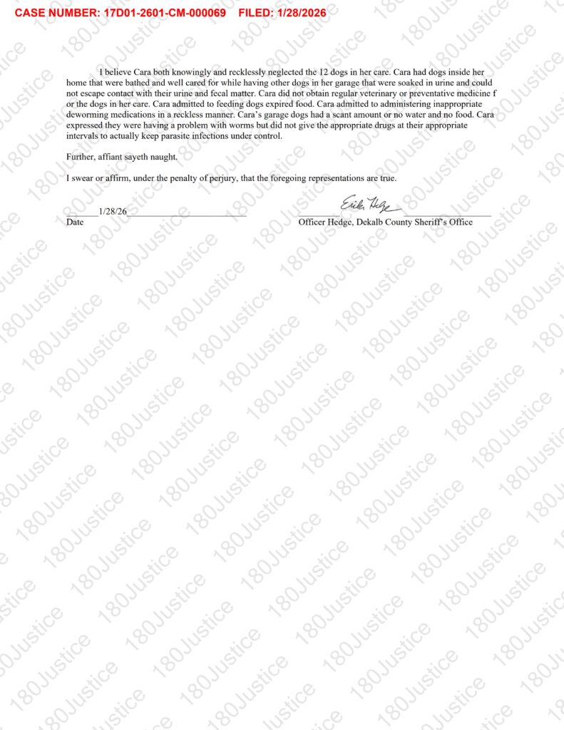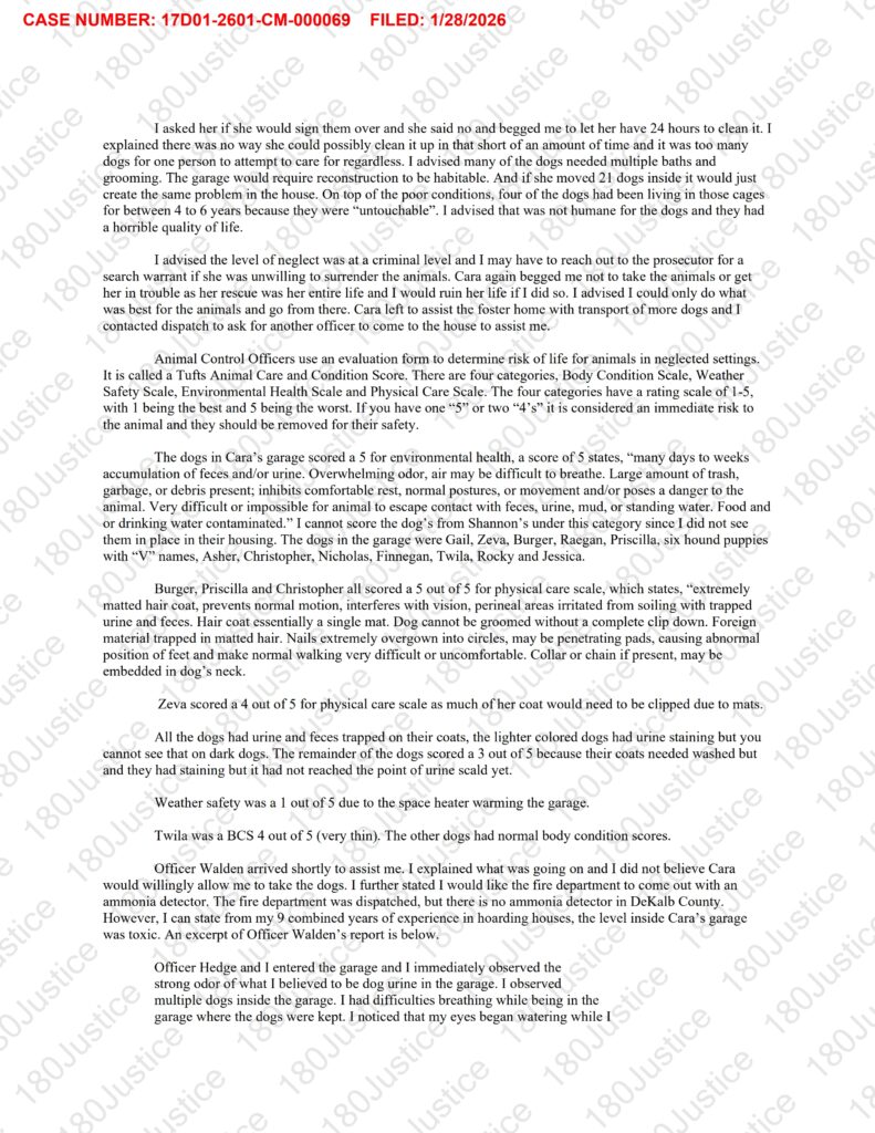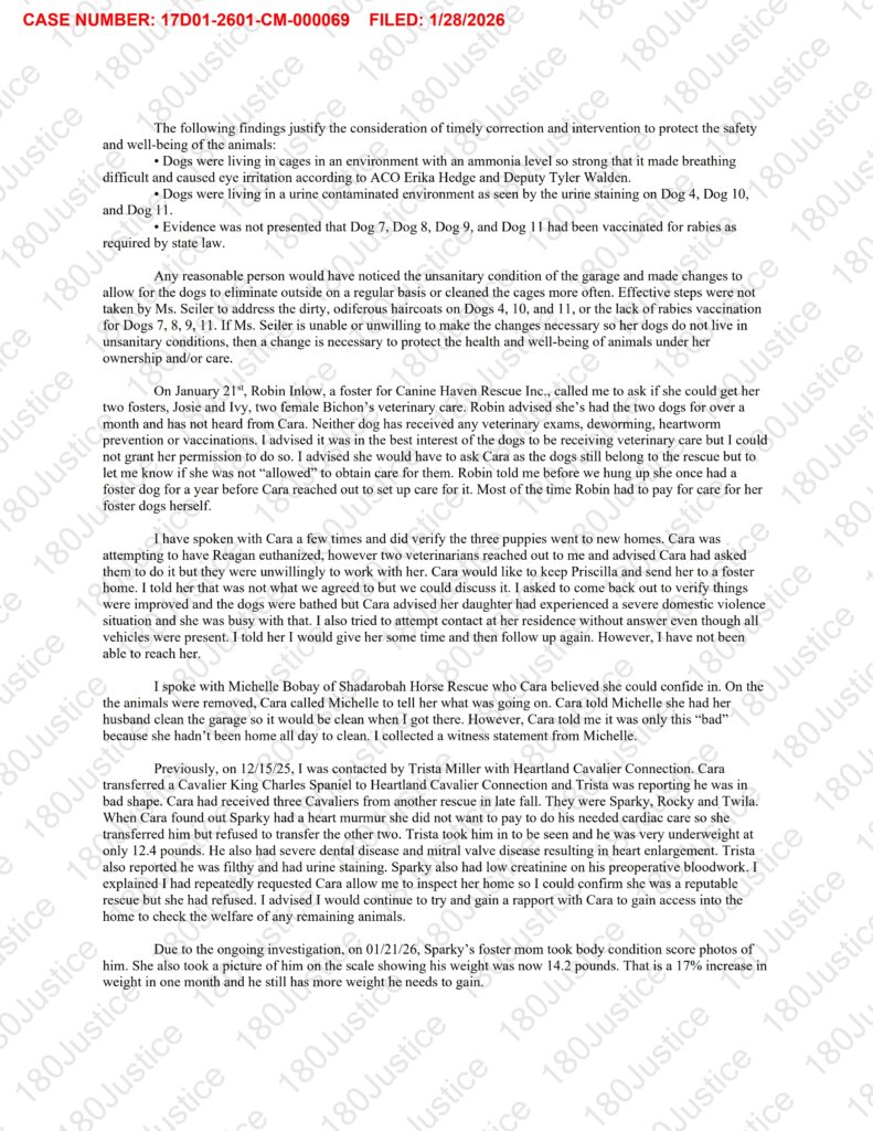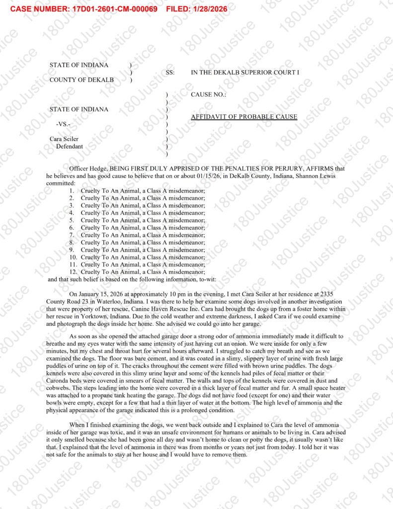According to court records, DeKalb County Sheriff’s Office animal control officers visited Seiler’s home earlier this month as part of an investigation into the rescue. During the visit, officers observed strong ammonia odors and unsanitary conditions in a garage where roughly 18 dogs were being kept. Many of the animals were allegedly surrounded by urine and feces, with few having access to food or water, and some being fed expired food.